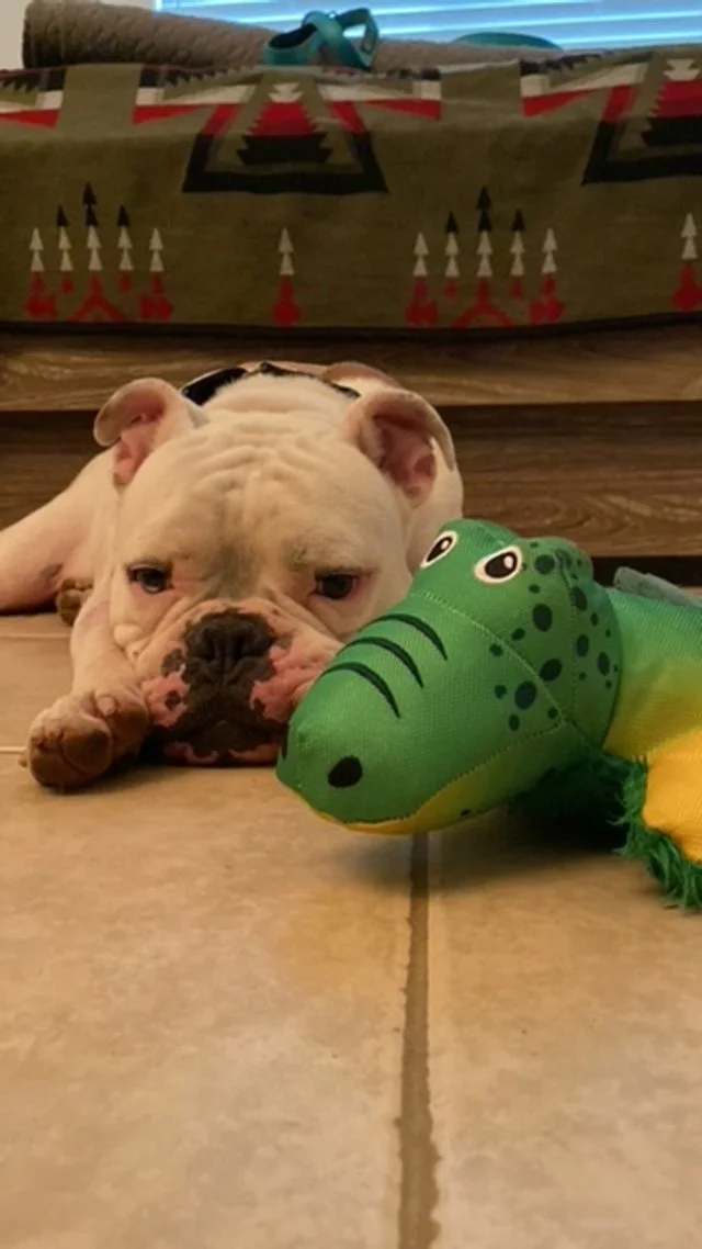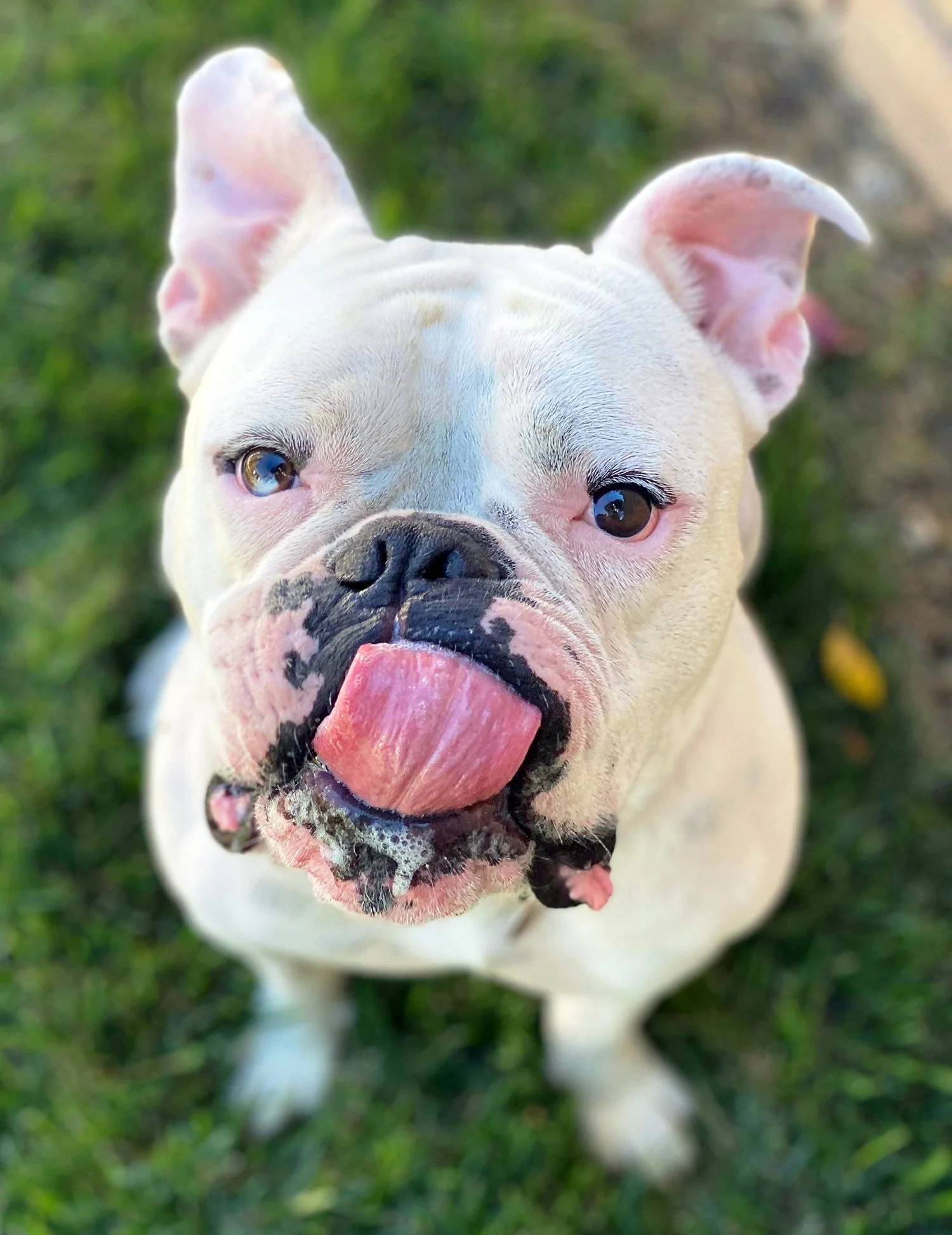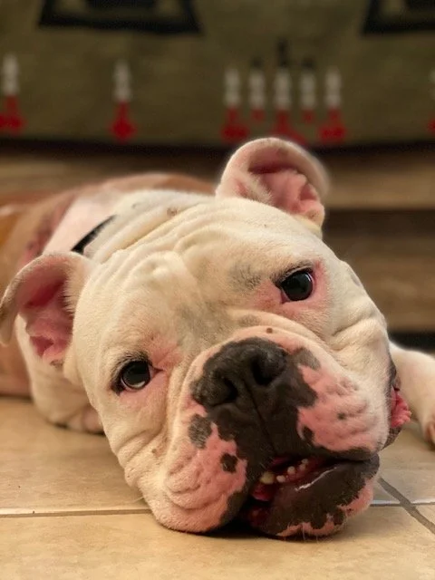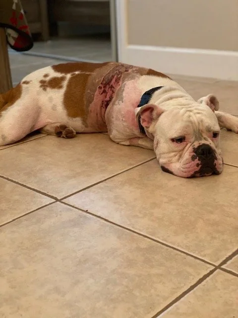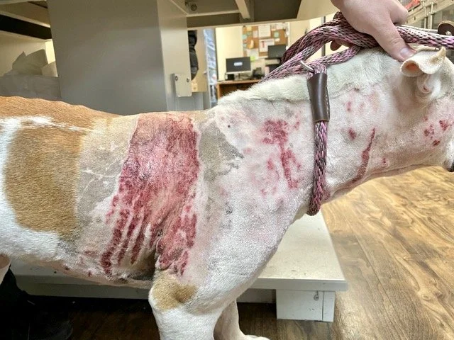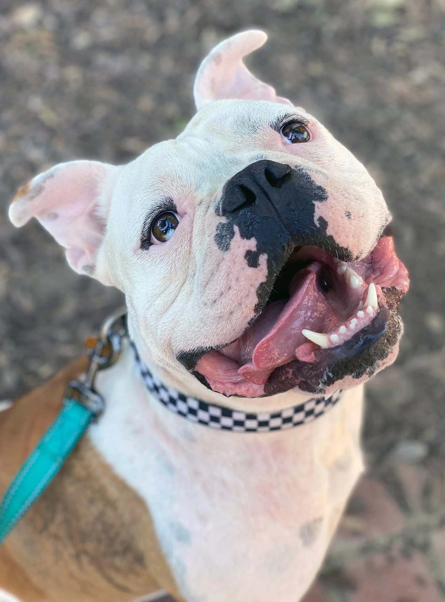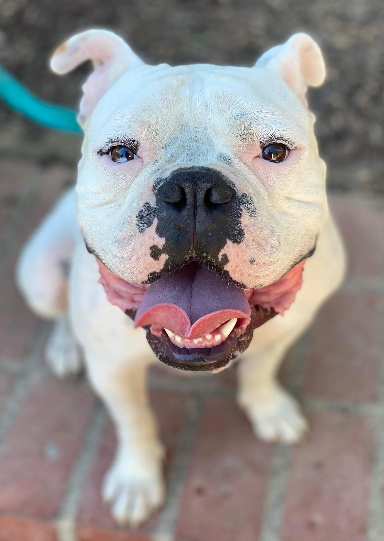 I'm Henry and I'm looking for my forever home! I'm just a baby at around 1 year old but I have had a tough life so far. I was found wandering the desert with suspected chemical burns on my skin. A nice man took me in and the rescue got me treatment. I'm feeling much better now! I don't let my past get me down. I love meeting people and am super sweet and polite. I'm good with other dogs and have not reacted to cats. I'm a compact 58 lbs but I am still a puppy so need some training and a strong handler. My ideal home would have no kids and bully experience. If you'd like to meet me, fill out a foster to adopt application and my rescue will contact you to further discuss!
