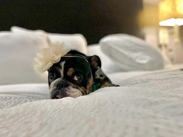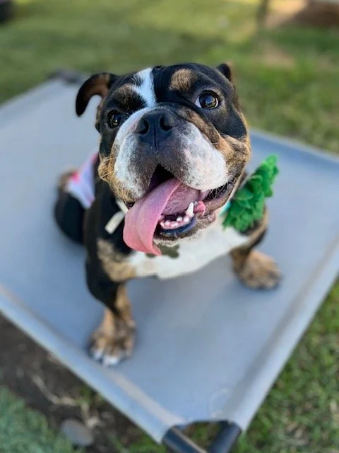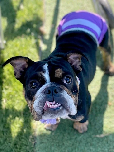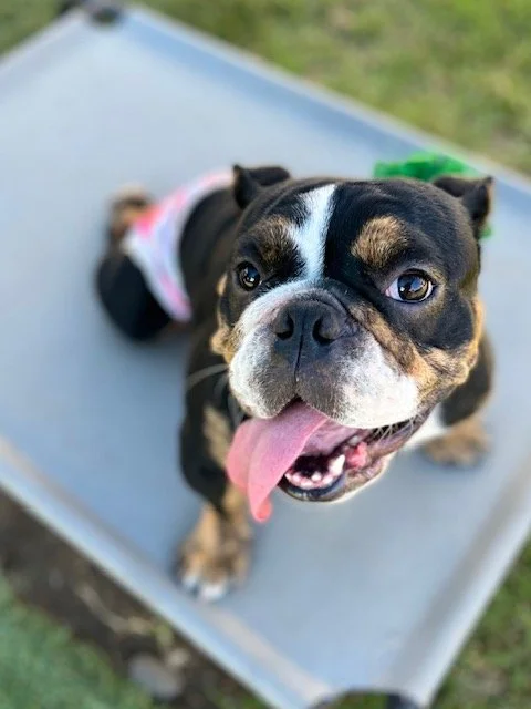 I'm Piper! I am a 1.5-year-old small English Bulldog with a big heart and lots of love to give. I love to sunbathe outside and play with puzzles and my lick mat. I'm great in both the car and my crate. I am fully urine and fecal incontinent so would do best with someone that is home frequently to change my diaper. But don't be intimidated! I'm a pro at the diaper changes and they only take a couple of minutes.